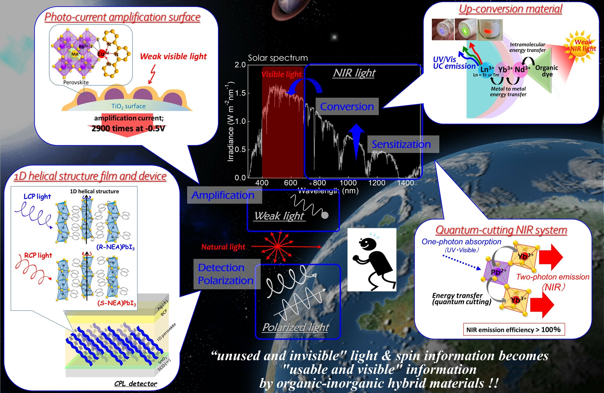 ・・・そこで石井研究室では、「見えない」光やスピン(弱い光や近赤外光、偏光)の情報を「見える」「使える」情報(強い光や可視光、電気エネルギー・信号)とすることで、光の利用効率を抜本的に改善するべく研究を進めています。特に、無機ナノ結晶と有機分子を融合(ハイブリッド)した特異的な界面構造を利用し、近赤外や円偏光などの見えない光を操作(検出・変換・増幅・偏極)する光電子デバイスやナノ材料の開発を行っています。